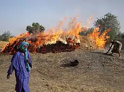 Damit die sogenannte keramische Wandlung stattfinden kann (das heißt die Verwandlung des Tons in eine endgültige und flüssigkeitsbeständige Form), muss eine Temperatur von 550–600 °C erreicht werden. Davor wird bei etwa 100 °C die beim Trocknen verbleibende Restfeuchtigkeit an die Luft abgegeben und bei einer weiteren Erhitzung auf 300 °C entweicht das chemisch gebundene Wasser (Kristallwasser). Wichtig während des Brandes ist die Zuführung von Sauerstoff, der beim Verbrennen des Brennstoffes verbraucht (reduziert) wird: „Wird er nicht weiter zugeführt, d.h. durch Öffnungen, Düsen oder Klappen, so entwickelt sich eine mit Kohlenmonoxid oder mit freiem Kohlenstoff angereicherte Brennatmosphäre, und es entsteht schwarzes bis schwarzbraunes Eisen-II-Oxid, das der gebrannten Keramik eine graue bis braunschwarze Farbe verleiht.“ Dies ist ein reduzierender Brand. Beim oxidierenden Brennvorgang (Oxidation) dagegen wird während des Brandes Sauerstoff zugeführt. Die Eisenminerale im Ton nehmen Sauerstoff auf und färben sich rot. Es entsteht dabei rotes bis rotbraunes Eisen-III-Oxid. Diese Keramik ist von rotbrauner Farbe.[26]