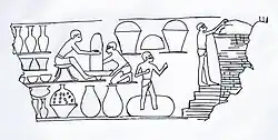 Hinweise auf die Funktion eines Gefäßes geben Darstellungen in Gräbern, Aufschriften, die Form, die Machart, Inhaltsreste und der archäologische Fundkontext. In den Gräbern sind die Gefäße oft nur schematisch gezeichnet. Trotzdem konnte in wenigen Fällen die Funktion der Gefäße anhand der Grabdarstellungen identifiziert werden. Dazu gehören Brotformen, Spinnschalen und Bierkrüge. Die Formen der Bierkrüge lassen sich anhand der Reliefdarstellungen (zum Beispiel in der Mastaba des Ti) mit Szenen der Bierherstellung festlegen: ovoide, rundbodige Flaschen mit häufig schwach ausgeprägter Randlippe, die meist grob geformt und aus einem stark mit organischen Bestandteilen gemagerten Ton hergestellt sind.[39][40]