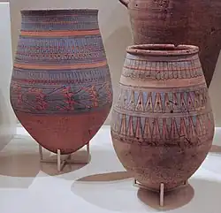- ↑ Die Decorated-Keramik besteht meist aus mit Sand gemagertem Mergelton. Die Oberfläche ist gut geglättet, jedoch nicht poliert. Die Farbe reicht von Hellrot bis Gelblich-Grau. Auf der Oberfläche wurde mit rot-brauner Farbe eine Bemalung aufgetragen. Hauptmotive sind Schiffe, Wüstenwild, Flamingos, Menschen, Spiralen, Wellenlinien und Z-Linien.