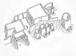 Der nächste technologische Fortschritt war das Einführen einer Lochtenne, die den Feuerraum von der Brennkammer trennt. Dadurch wird verhindert, dass rauchige Flammen und carbonisiertes Brennmaterial mit der Keramik in Kontakt kommen und Flecken und Schmauchung verursachen.[32] Die zu brennenden Gefäße wurden im oberen Teil aufgestapelt, mit der Öffnung nach unten. Die heißen Gase stiegen an den Gefäßen vorbei auf und zirkulierten in ihnen, und dadurch wurde der Ton gebrannt.[33] Solche Schachtöfen mit Lochtenne sind seit dem Alten Reich durch bildliche Darstellungen und archäologische Funde belegt.