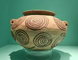 Eine wichtige Erfindung war die achsenzentrierte Töpferscheibe. Diese ermöglichte es dem Töpfer, mit der einen Hand die Unterlage mitsamt dem Gefäß zu drehen und mit der anderen Hand das Gefäß zu formen.[22]