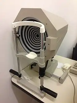 Der Keratograph (auch Videokeratometer genannt) ist ein Instrument zur Erfassung und Auswertung der Topographie der Hornhaut. Eine Placido[1]-Scheibe (Ringsystem mit konzentrisch abwechselnd schwarzen und weißen Ringen) wird dabei auf die Hornhautvorderfläche projiziert, die ringförmigen Reflexbilder werden mit einer Videokamera aufgenommen und durch ein Computersystem mit einer Fourier-Analyse ausgewertet. Ursprünglich wurde die Scheibe vom portugiesischen Augenarzt António Plácido da Costa schon 1880 erfunden. Placido erkannte, dass durch die Verwendung von reflektierenden Ringen, die auf die Hornhaut projiziert wurden, Abweichungen von der normalen Krümmung sichtbar gemacht werden konnten. Wenn die Hornhaut eben war, würden die Ringe gleichmäßig erscheinen, aber bei einer unregelmäßigen Form oder Krümmung würden sich Verzerrungen zeigen.[2]