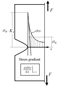 Erreicht die Kerbwirkungszahl betragsmäßig den Wert der (elastizitäts-theoretischen) Kerbformzahl (oder auch ) ist die theoretisch errechnete Spannungsspitze voll schädigungswirksam; ist die Kerbwirkungszahl dagegen 1, bedeutet das, dass sich die Kerbe gegenüber einem ungekerbter Probestab, mit den Abmessungen des Kerbquerschnitts, nicht festigkeitsmindernd auswirkt.[19] Das Verhältnis zwischen theoretischer und schwingfestigkeitswirksamer Spannungsüberhöhung wird dabei mittels einer Stützziffer ausgedrückt: