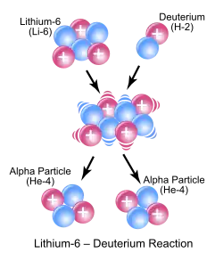 Ein Lithium-6-Kern absorbiert ein Neutron und geht dadurch über in ein Triton und einen Helium-4-Kern: