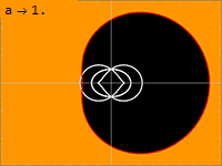 Größenvergleich des Schattens (schwarz) und der besonderen Flächen (weiß) eines Schwarzen Lochs. Der Spinparameter läuft von 0 bis wobei die linke Seite des Schwarzen Lochs auf den Beobachter zu rotiert.[9]