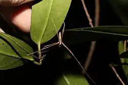 Die Beinformel (absteigende Längenformel der Beinpaare) lautet 1-2-3-4. Das erste Beinpaar ist sehr schmal und lang, es kann dreimal so lang wie der Körper ausfallen. Die Meta- (Fersen-) und Tarsen (Fußglieder) des vierten Beinpaars weisen ventral (unten) Makrosetae auf. An den Beinen befinden sich je drei Tarsalklauen. Die Pedipalpen (umgewandelte Extremitäten im Kopfbereich) der Weibchen sind gänzlich unmodifiziert.[3]