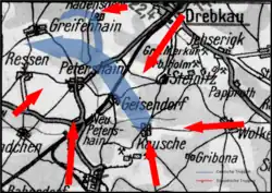 4. Ausbruchsrichtung nach Nordwesten, um im Raum südlich von Berlin Anschluss an die eigenen Truppen (Armee Wenck) zu gewinnen. Der Ausbruch soll durch Wälder der Niederlausitz erfolgen.[2]