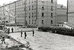 ![]() Deutscher Spähtrupp der 4. Armee in einem nach Artilleriebeschuss brennenden Dorf bei Mogilew (16. Juli 1941) | |||||||||||||||||