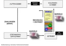 Sie rechnen ihre Arbeitsleistungen mit ihren Auftraggebern unter falschem Namen ab. Auch die Beschäftigten der Kolonnenschieber arbeiten schwarz. Kolonnenschieber erhalten ihr Geld ebenfalls über die Bankkonten der Servicefirmen, wobei auch hier eine „Provision“ bei der Servicefirma verbleibt.