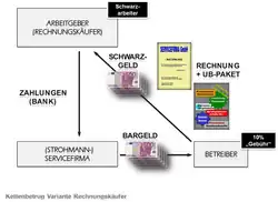 Das sind Unternehmer, die ihr Personal mit zu niedrigen Entgelten zur Sozialversicherung anmelden, um Beiträge zu sparen. Sie zahlen einen Teil der Löhne „schwarz“. Diese Schwarzlöhne werden als Zahlungen an Subunternehmer vorgetäuscht. Hierzu verbuchen die Unternehmer die Rechnungen der Servicefirmen als Fremdleistung und überweisen das Geld auf das Konto der Servicefirma. Dort wird es umgehend wieder abgehoben und als Bargeld an die Überweiser zurückgegeben. Von dem zurückfließenden Bargeld können dann die Schwarzlöhne gezahlt werden. Einen Teil des Bargeldes behalten die Betreiber der Servicefirmen als „Provision“.