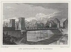 Darauf baute der Bamberger Kreisbaumeister Franz Jos. Schierlinger nach dem Vorbild der von Friedrich Schnirch in Saaz errichteten Brücke[9] eine schmiedeeiserne Kettenbrücke mit Pylonen von Leo von Klenze. Sie wurde am 31. Dezember 1829 eröffnet und offiziell Ludwigsbrücke, umgangssprachlich aber meist Kettenbrücke genannt.