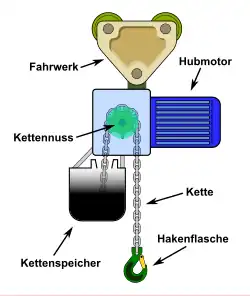 Hubmotor, Getriebe, Kettenführung, Kettennuss, Hakenflasche, Rundstahlkette und Kettenspeicher.