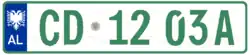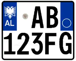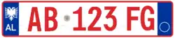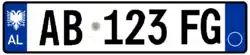 Die aktuellen Kfz-Kennzeichen wurden am 16. Februar 2011[1] eingeführt und orientieren sich maßgeblich an den italienischen Euro-Kennzeichen. Die Schilder zeigen an beiden Enden ein blaues Feld. Am linken Rand beinhaltet es den Doppeladler des albanischen Wappens sowie das Nationalitätszeichen AL. Auf der rechten Seite kann das Zulassungsjahr sowie der Regionscode im blauen Feld erscheinen. Beide Angaben sind allerdings wie in Italien freiwillig und werden eher selten dargestellt, sodass das rechte blaue Feld häufig leer bleibt. Die eigentliche Kombination ist fortlaufend und ermöglicht somit keinerlei Rückschlüsse auf die Herkunft des Fahrzeuges. Sie besteht aus zwei Buchstaben, gefolgt von einem Hologramm, drei Ziffern und weiteren zwei Buchstaben.[2]