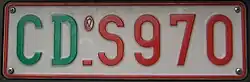 Diese Kennzeichen hatte einen weißen Hintergrund und einen roten Rand. Die Aufschrift bestand aus der Buchstabengruppe CD in grüner Schrift und einem trennenden Unterstrich sowie einem Buchstaben und drei Ziffern in roter Schrift, beziehungsweise seit dem Auslaufen dieses Systems mit Z 999 im Frühjahr 2008 das umgekehrte System (CD.001A).
