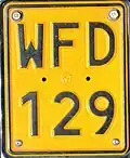 Diese Kennzeichen hatten einen gelben Hintergrund mit schwarzer Schrift und schwarzem Rand. Die Aufschrift bestand aus einer Gruppe von drei Buchstaben, die mit M oder W begann, über einer Gruppe von drei Ziffern.