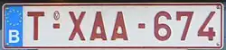 Ausländer oder Belgier, die sich nur vorübergehend in Belgien aufhalten und ein Kraftfahrzeug benutzen, das keine ausländischen Kennzeichen hat, bekommen ein vorläufiges Kennzeichen oder ein Transitkennzeichen, dessen Hintergrund rot (RAL 3020) ist. Die Schrift und der Rand sind weiß. Nach dem EU-Symbol folgen seit dem 2. Mai 2016 ein Buchstabenpaar, das mit einem W beginnt, ein Ziffernpaar, das das Jahr der Gültigkeit angibt, und drei Buchstaben.