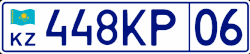 Die aktuellen Schilder wurden im August 2012 eingeführt. Sie zeigen am linken Rand die wehende Flagge Kasachstans und das NationalitätszeichenKZ. Bei Privatfahrzeugen folgen zunächst drei Ziffern und drei Buchstaben, Fahrzeuge von Organisationen zeigen nur zwei Buchstaben. Am rechten Rand wird mittels eines schwarzen vertikalen Strichs ein Feld abgegrenzt, in dem eine zweistellige Zahl die Herkunftsregion angibt. Fahrzeuge von Ausländern, ausländischen Unternehmen und Joint Ventures besitzen Nummernschilder mit gelbem Hintergrund. Sie zeigen die Buchstaben F (Ausländer) oder H (Unternehmen), vier Ziffern und das Regionsfeld.[1]