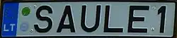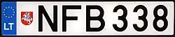 Am linken Rand befindet sich ein blaues Feld mit den europäischen Sternen und dem Nationalitätszeichen LT, das am 20. September 2004 und damit kurz nach dem Beitritt Litauens zur Europäischen Union am 1. Mai 2004 eingeführt wurde.[1] Zwischen dem Buchstaben- und Zahlenblock erscheint ein Aufkleber der Hauptuntersuchung (litauisch TA = techninė apžiūra) sowie eine Hologramm-Plakette. Neben dem Standardmaß existieren Schilder in US-amerikanischer Größe sowie zwei verkleinerte Formate für Zweiräder. Die genaue Herkunft des Fahrzeugs kann an den Schildern nicht abgelesen werden.