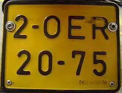 - Exportkennzeichen zeigen zunächst eine Zahlenkombination. Nach einem Bindestrich folgen der oder die Regionsbuchstaben. Der Hintergrund der Schilder ist gelb, und am rechten Rand befindet sich ein weißes Feld mit den Buchstaben EXP und dem Gültigkeitsdatum.