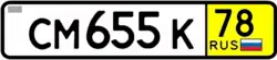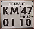Weiß-gelbe Kennzeichen gelten für Fahrzeuge, die zwischen Kauf und Verkauf überführt werden. Sie zeigen zwei Hologramme und bestehen aus laminiertem Papier. Das Aussehen entspricht bis auf die Farbe des rechten Feldes dem der normalen Kennzeichen. Die laminierten Überführungskennzeichen lösten 2010 die Transitkennzeichen ab.[3] Sie bestanden aus Papier und wurden an Front- und Heckscheibe geklebt. Zusätzlich zur Nummer des Subjekts und der Erkennungsnummer zeigten sie das Wort „ТРАНЗИТ“ (Transit) zu Beginn.