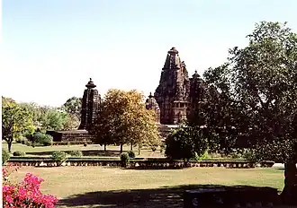 Der Großteil der imposanten Tempel im Tempelbezirk von Khajuraho wurde von den Herrschern der Chandella-Dynastie zwischen 950 und 1120 unserer Zeitrechnung erbaut. Sie sind heute eine der bedeutendsten Touristenattraktionen Indiens. Die frühen Tempel Khajurahos (Lalguan-Mahadeva-Tempel, Brahma-Tempel) sind zwar aus Stein errichtet, haben aber – wie die Lehmhäuser – glatte und ungegliederte Außenwände, nur einen Eingang und keine Fenster. Diese einfachen Tempel der Frühzeit entwickelten sich im Laufe von Jahrhunderten zu immer komplexeren Strukturen mit hohen Shikhara-Türmen (Lakshmana-Tempel, Kandariya-Mahadeva-Tempel).