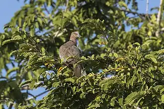 Die Kichertaube erreicht eine Körperlänge von 30 Zentimetern.[1] Sie ist damit etwa so groß wie eine Lachtaube, aber ist erheblich kräftiger.[2]