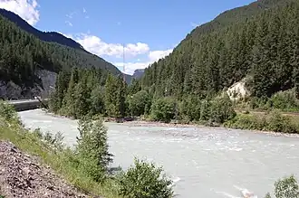 ![]() Kicking Horse River beim Park Bridge rest area nahe Golden. Trans Canada Highway links, CPR Mainline rechts | ||