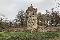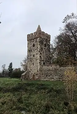 Der Turm ist auf annähernd quadratischem Grundriss errichtet. Im oberen Teil befindet sich ein Wohnbereich mit einem Kamin und Fenstern.