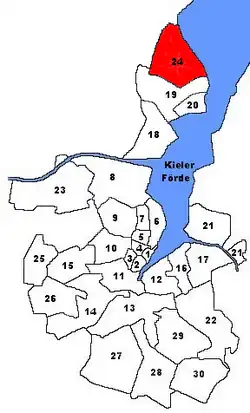 - ↑ Quartalsdaten aus den Stadtteilen I 2024. (PDF; 1,57 MB) Stadt Kiel, S. 4, abgerufen am 26. Juni 2024.