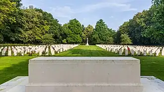 In der Sichtachse befindet sich im Hintergrund die Ehrenhalle, in ihr wird ein Kriegstagebuch und das Totenregister aufbewahrt. Ihr wiederum vorgelagert steht der mit der Inschrift „Their Name Liveth For Evermore“ versehene Altarstein („Stone of Remembrance“), und schließlich diesem vorangestellt das Opferkreuz mit aufgelegtem Langschwert.