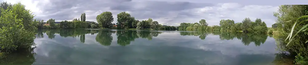 | Kiessee Klein Schneen, Blick nach Norden, zwischen den Büschen rot ein durchfahrender Zug auf der Bahnlinie. | ||