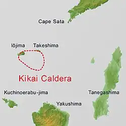 Die Kikai-Caldera ist Teil des Pazifischen Feuerrings. Sie befindet sich im Übergangsbereich vom japanischen Festland (Kyūshū) zum nördlichen Inselbogenabschnitt der Ryūkyū-Inseln. Die Caldera liegt über der Subduktionszone der Philippinenseeplatte, die im nördlichen Ryūkyū-Graben unter das Ostchinesische Meer bzw. den östlichen Kontinentalrand der Eurasischen Platte mit einer Geschwindigkeit von 49 Millimeter/Jahr in nordwestlicher Richtung abtaucht.[2] GPS-Messungen belegen für den Bereich der Caldera einen recht geringen Bewegungsvektor von rund 5 Millimeter/Jahr gen Südost.[3] Das Ostchinesische Meer zeigt mit dem auf das Festland übergreifenden Beppu-Shimabara-Graben des nördlichen Okinawa-Trogs eine in diesem Bereich beginnende, sich noch im Rift-Stadium befindliche Backarc-Spreizung. Weiter nördlich schließen sich auf Kyūshū mit der Ata-, der Aira- und der Kakuto-Caldera weitere Riesencalderen an, die ebenfalls hochexplosiven Ursprungs sind. Das weiter südwestlich gelegene Kuchinoerabu-jima besitzt Kompositstratovulkane und auch die sich anschließenden Amami-Inseln weisen ihrerseits größere Stratovulkane auf.