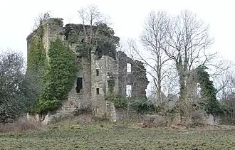 Der beeindruckende Donjon aus dem 15. Jahrhundert bedeckt eine Grundfläche von 12,77 × 10,03 Metern; die Mauern sind 2,12–2,43 Meter dick.[10] Es gab einen Keller und eine Schlafkammer unter einem Gewölbe. Ein weiteres Gewölbe beherbergte einen Rittersaal, der durch drei Fenster in der Südmauer und ein Fenster hoch oben in der Nordmauer belichtet war. Darunter lag ein privater Raum. Der Turm war vier Stockwerke hoch und in der Nordwestecke gab es ein „Hungerloch“-Gefängnis, das man über eine Klappe von einem Gang einer Treppe auf der Ebene des Dachgeschosses erreichen konnte.[11] Es gab keine Schießscharten.[10]