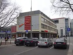Kinderkaufhaus 1967 von der Webergasse aus gesehen, im Vordergrund die Plastik Traubenesser von Erich Otto (1962)