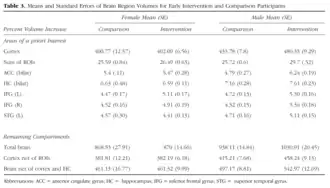 Eine randomisierte Studie zeigte, dass fünf Jahre frühzeitiger qualitativer kognitiv und sprachlich stimulierender Zentrums-Betreuung, die 3–21 Wochen nach der Geburt begann, bei männlichen Probanden mit niedrigem Sozialstatus bis zum mittleren Lebensalter zu signifikanten Veränderungen der Gehirnstruktur führte. Die untersuchten MRT-Scans der Teilnehmer des Abecedarian Early Intervention Projects zeigten, dass die Volumina mehrerer Hirnregionen und das Gesamthirnvolumen bei den Teilnehmern des Kinderbetreuungsprogramms wesentlich größer waren als in der Kontrollgruppe.[38][37]