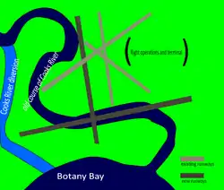 Gegen den Bau in Mascot sprachen jedoch vor allem die Komplikationen einer langen Flussumleitung sowie Lärmschutzaspekte. Für den Bau der Flussumleitung mussten alleine rund zwei Millionen Kubikmeter Erde bewegt werden, zudem war die Verlegung von Straßen und Bahnlinien für die Realisierung notwendig.[19] Eine andere für den Bau präferierte Gegend hätte bei Bankstown gelegen und somit deutlich entfernter vom Stadtzentrum.