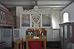 Das mit einem Satteldach bedeckte Kirchenschiff ist im Innern mit einer Flachdecke überspannt, die von achteckigen, hölzernen Pfeilern getragen wird. Die Orgel mit sechs Registern, einem Manual und einem Pedal in einem spätklassizistischen Prospekt wurde um 1864 von Jakob Vogt gebaut.[1]