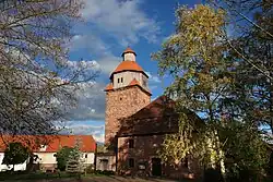 Das Langhaus ist mit einem Mansardwalmdach bedeckt. Im steinernen Teil des Turms sind noch einige Schießscharten vorhanden. Er hat einen achtseitigen Aufsatz aus mit Brettern verkleidetem Holzfachwerk, hinter dessen Klangarkaden sich der Glockenstuhl befindet, in dem seit dem Jahr 1957 wieder drei Kirchenglocken hängen, von denen die älteste aus dem frühen 16. Jahrhundert stammt. Darauf sitzt eine glockenförmige Haube, die von einer Laterne bekrönt wird. Der Zugang zu den Obergeschossen war ehemals nur von außen erreichbar. Das Untergeschoss des Turms öffnet sich mit einem Spitzbogen in den Saal. Ein Kreuzrippengewölbe über Konsolen bildet den oberen Raumabschluss.