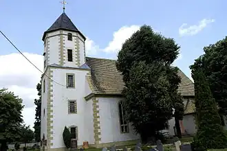 Im Jahr 1769 wurde die inzwischen baufällig gewordene Kirche einem Neubau gleich wiederum erneuert. Eine über dem südlichen Eingang befindliche Tafel erinnert: Im Jahre MDCCLXIX ist unter Gottes Beistand dieses Haus erneuert worden. Er wohne darinnen und sei bei uns mit seiner Gnade. Die Saalkirche ist aus Naturstein und gebrannten Ziegelsteinen gemauert. An den Längsseiten befinden sich je drei langgezogene Rundbogenfenster mit Maßwerk im gotischen Stil. Jeweils zwei Fenster rechts und links hinter dem Altar geben ausreichend Licht in den Kirchenraum. Der einfache, fast quadratische Turm, ab der halben Dachhöhe als Achteck hergestellt, wurde im Jahr 1750 mit einer vergoldeten Wetterfahne ausgestattet.