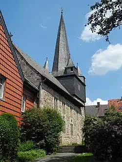 Die ältesten Teile der Saalkirche sind der gedrungene mittelalterliche Chorturm und das Kirchenschiff einer Wehrkirche aus Bruchsteinen. Im 17. Jahrhundert wurde dem Turm ein weiteres Geschoss aus schiefergedecktem Holzfachwerk aufgesetzt, das mit einem achtseitigen spitzen Helm bedeckt wurde, der von vier Wichhäuschen an den Ecken flankiert wird. Das Kirchenschiff wurde im 16. Jahrhundert verändert. 1886 wurde es nach einem Entwurf von Gustav Schönermark im Westen um ein Joch aus Quadermauerwerk verlängert und im Baustil der Neorenaissance umgebaut. Das rundbogige Portal an der Südseite sowie die Schießscharten der mittelalterlichen Wehrkirche wurden vermauert. Das Kirchenschiff erhielt doppelgeschossige Fenster und zwei gleiche, als Ädikula gestaltete Portale auf der Süd- und Nordseite. Im Chor ist das mittelalterliche Kreuzgratgewölbe erhalten. Das Kirchenschiff erhielt beim Umbau eine Kassettendecke, Emporen und ein neues Kirchenbänke. Die Orgel wurde 1894 von Robert Knauf aus der Orgelbauerfamilie Knauf gebaut.