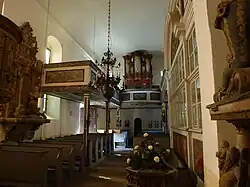 Im Innern ist im Schiff und im Chor eine hölzerne Muldendecke über einem Gesims und hölzerne Emporen eingezogen; deren Entwurf wird David Schatz zugeschrieben.[1]