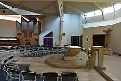 Die Mitte des Seelsorgezentrums bilden der Altar und Ambo, die vom Künstler Gernot Völkl entworfen wurden. Die Christusstatue stammt vom österreichischen Bildhauer Josef Pillhofer. Die Sesselreihen sind im Halbkreis um den Altarraum gruppiert. Erwähnenswert sind die Loreto-Madonna, eine Dauerleihgabe aus dem Universalmuseum Joanneum, und eine Ikone von Wladimir Zagorodnikow. Die Anton-Lippe-Gedächtnisorgel besteht aus 25 Registern und wurde 1984 erbaut. Im Glockenturm befinden sich vier Glocken, mit den Namen Christus-, Marien-, Elisabeth- und Michaelglocke. Sie wurden 1994 in Passau gegossen. Sowohl die Orgel, als auch der Kirchplatz wurden nach dem Domkapellmeister und Domvikar Anton Lippe benannt (1905–1974).