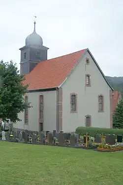 Die hell verputzte, mit einem Satteldach bedeckte Saalkirche hat rot abgesetzte Ecksteine. Die nach Norden gerichtete Fassade mit dem Portal ist als Schaufront durch Lisenen untergliedert und von einem Giebel mit Voluten abgeschlossen. Das Erbauungsjahr 1785 findet sich im Schlussstein des Portals wieder. Der Dachturm hat ein verschiefertes Geschoss mit Klangarkaden. Dahinter verbirgt sich der Glockenstuhl. Darüber erhebt sich eine welsche Haube.