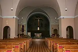 Der Pulverturm beim Lindenkreuz stammte aus dem 18. Jahrhundert.[1] Der Kircheninnenraum ist schlicht gestaltet und entstand durch Umbaumaßnahmen am Vorgängerbau. Nach der Errichtung der Apsis, einer Empore für Chor und Orgel, entstand ein Hauptschiff mit Seitengängen. Außen wurden ein Turm und eine Vorhalle angebaut. Das Fresko der Apsis stellt die Gottesmutter Maria, das Jesuskind, Don Bosco und Gottvater mit zwei Engeln dar. Die Entwürfe stammen vom Künstler Ludwig von Kurz-Goldenstein.
