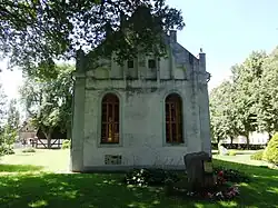 Östlich des Chors steht ein Findling mit einer Gedenkplatte, welche die Aufschrift trägt: „Im Gedenken / an Opfer von / Gewalt, Krieg, / Flucht und / Vertreibung“. Darüber ist eine Friedenstaube abgebildet. Nördlich dieses Steines ist eine kleine Gedenktafel mit der Aufschrift: „1945 wurden hier / 4 Soldaten und / 2 Frauen / beigesetzt.“.