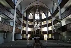 Der Innenraum ist mit einem Kreuzgratgewölbe überspannt, dessen Gurtbögen eine florale Bemalung tragen, die Wandpfeiler sind als toskanische Pilaster ausgeführt. An der Ost-, Süd- und Nordwand befinden sich dreigeschossig umlaufende Emporen mit schmucklosen Brüstungsfeldern. An der Westwand steht die Orgelempore, darunter befindet sich auf vier Konsolen eine herrschaftliche Loge.[1]