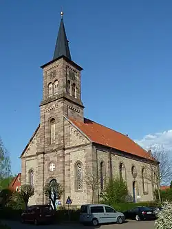 Die alte Kirche war zu klein geworden, deshalb wurde sie 1853 abgerissen. Die neue Saalkirche im neuromanischen Baustil war 1853 fertiggestellt, wie an der Vorderseite des Dachturms über dem Portal und unterhalb eines Vierpasses steht. Die Mauern sind aus Bruchsteinen und mit Lisenen und Ecksteinen aus Sandstein gegliedert. Die Gewände der Bogenfenster sind ebenfalls aus Sandstein. Der Turm trägt einen spitzen schiefergedeckten Helm.