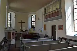 Die kleine Saalkirche ist seit dem 14. Jahrhundert durch mehrere Umbauten und Erweiterungen aus einer Kapelle erwachsen. Sie hat dadurch gestaffelte Bauteile unterschiedlichen Alters. Der im Erdgeschoss aus Quaderwerk bestehende, turmartig überhöhte Westteil ist noch romanischen Ursprungs. Er ist mit einem Satteldach bedeckt, der einen schiefergedecktenDachreiter trägt. Der östliche, längere und polygonal schließende Teil der Kirche wurde erst im Spätmittelalter aus unregelmäßigem Mauerwerk erbaut. An seiner Südseite entstand 1771 ein zweigeschossiger Anbau für die Sakristei und die Patronatsloge. Er ist bedeckt mit einem niedrigen Walmdach. 1964 bis 1967 wurde der Innenraum der Kirche nach dem Abbruch des Kanzelaltars und der Emporen im Langhaus neu gestaltet. Die Kirchenausstattung von 1967 ist bescheiden. Im Ostpolygon befinden sich zwei barocke Epitaphe mit Inschriften auf Kartuschen, die mit Engeln verziert sind. Die Orgel wurde 1841 von Ernst Poppe & Sohn gebaut.[2] 1991 bis 1998 erfolgte eine umfassende Außen- und Innenrenovierung der Kirche.