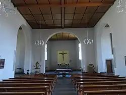 Die heutige Kirche ist eine Saalkirche mit offenem Querschiff und gefluchtetem, dreiseitig geschlossenem Chor. Am Scheitelpunkt des Chors steht der Kirchturm mit Zwiebelhaube. Der Westeingang wird von einer Säulenvorhalle umrahmt. Das innere Dach ist ein flacher Gipslatten-Plafond von 1960. Dazu finden sich im inneren zwei Statuen der heiligen Antonius und Franziskus aus der Mitte des 17. Jahrhunderts. In der Nördlichen Kapelle steht eine Pietà, vermutlich aus dem 14. Jahrhundert, sowie eine Auswahl von Votivbildern seit 1749.