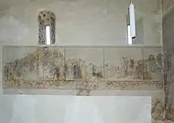 Bei der Renovation wurden Wandmalereien sowohl an der westlichen Fassade, als auch an den Wänden im Innern gefunden. Links vor dem Eingang sind unter einem gemalten Bogenfries die an ihren Attributen erkennbaren Heiligen Leonhard, Mauritius, Stephanus, Laurentius und einem weiteren Unbekannten zu sehen. Im Inneren sind florale Ornamente in den Fensternischen und am Chorbogen erhalten. Von fünf Bildern an der Südwand aus einem ursprünglichen Zyklus zeigt eines den auferstandenen Christus als Gärtner mit Maria Magdalena, die anderen sind weniger gut erhalten. Die Westwand trägt eine Darstellung des Jüngsten Gerichts, dazu eine Mandorla mit dem thronenden Christus, flankiert von den vier Evangelistensymbolen mit Maria und Johannes. Unter einer umlaufenden Rankenbordüre sind grossflächige Reste von Würfelmustern erhalten. Die Malereien sind in ihrer Art mit denen von Belp oder Kirchlindach vergleichbar, ohne jedoch deren Qualität zu erreichen.